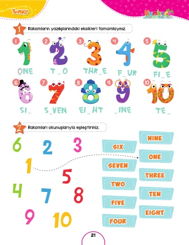 1 Rakamların yazılışlarındaki eksikleri tamamlayınız. 1 2 3 4 5 6 7 8 9 10 2 Rakamları okunuşlarıyla eşleştiriniz. NINE SIX ONE SEVEN THREE TWO TEN FIVE eight FOUR 21