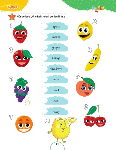 1 Görsellere göre kelimeleri yerleştiriniz. 2 1 apple banana grapes 3 4 orange strawberry 5 6 melon peach lemon 9 cherry 7 8 51