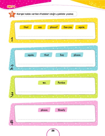 UNIT 4 UNIT 4 9 Karışık halde verilen ifadeleri doğru şekilde yazınız. that say please? Can you again, 1 again, that Say please. 2 me. Pardon 3 please. Slowly 4 26