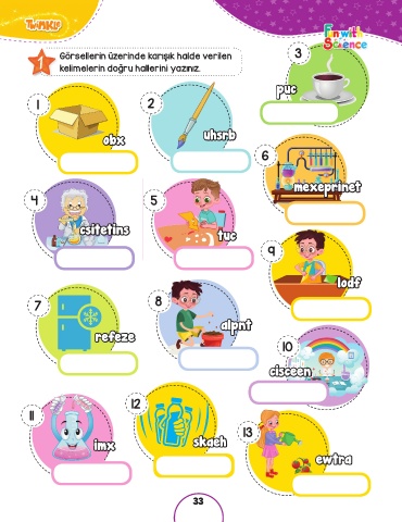 1 Görsellerin üzerinde karışık halde verilen 3 kelimelerin doğru hallerini yazınız. puc 1 2 obx uhsrb 6 mexeprinet 4 5 csitetins tuc 9 lodf 7 8 alpnt refeze 10 cisceen 12 11 13 imx skaeh ewtra 33