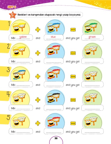 5 Renkleri ve karışımdan oluşacak rengi yazıp boyayınız.