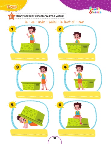 6 Danny nerede? Görsellerin altına yazınız. in – on – under – behind – in front of – near 1 2 3 4 5 6 37