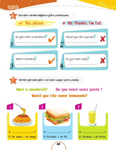B: Yes, please. I am hungry. B: No,thanks. I am full. B: Yes,please. I am thirsty.