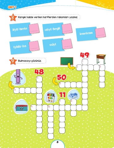 UNIT 1 UNIT 1 8 Karışık halde verilen harflerden rakamları yazınız. ifytf-hrete ofryt-hegit ienetenn tyhitr-ixs sxiyt 49 9 Bulmacayı çözünüz. 1 2 3 48 50 4 5 6 11 7 8 9 10 8